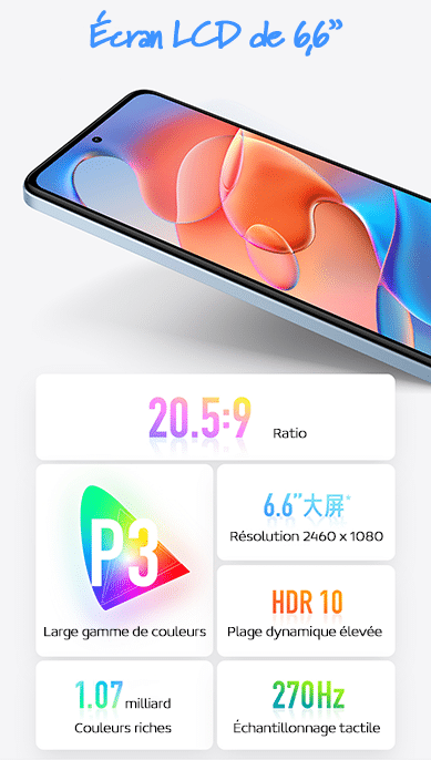 Le Redmi Note 12T Pro est équipé d’un écran LCD haut de gamme de 6,6’’ avec un taux de rafraîchissement variable de 144Hz et un taux d’échantillonnage tactile de 270Hz. L’écran utilise la large gamme de couleurs DCI-P3 et un rapport de contraste de 1 400:1. L’écran LCD est calibré un par un avant de quitter l’usine, de sorte que chaque écran puisse présenter avec précision les couleurs. Il est percé afin de laisser la place à la caméra selfie de 16Mp.