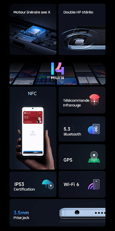 Le Redmi Note 12T Pro dispose d’un moteur linéaire axe X offrant de bonne vibration lors de vos sessions de jeux. Un son surround Dolby Atmos est proposé et le téléphone intègre une prise jack ! Le téléphone dispose du WiFi 6, du Bluetooth 5.3 et du NFC, et il est certifié IP53.
