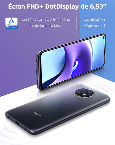 Le Redmi Note 9T est équipé d’un grand écran FHD+ DotDisplay de 6,53’’ avec un ratio d’affichage de 19,5:9. L’écran est certifié TÜV Rheinland Low Blue Light et dispose d’une caméra selfie de 13Mp. Cet écran est protégé par du Corning® Gorilla® Glass 5. Le capteur d’empreinte pour déverrouiller l’appareil a été caché dans le bouton Power.