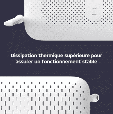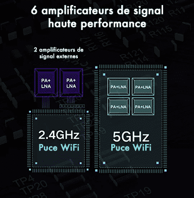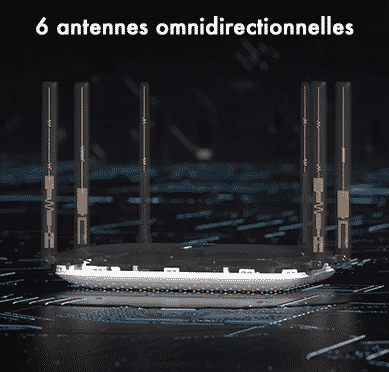 En regardant le routeur, on remarque un nombre important d’antennes. Avec 6 antennes omnidirectionnelles à gain élevé de 5dBi, avec une structure et disposition étudiée, la couverture est plus large et la distance de transmission est plus longue même dans des environnements complexes. Ce routeur est équipé de 6 amplificateurs de signal haute performance, 2 amplificateurs (PA + LNA) pour la bande 2,4Ghz et 4 amplificateurs (PA + LNA) pour la bande 5Ghz. Vous améliorez ainsi considérablement la couverture et la stabilité du signal à travers les murs.
