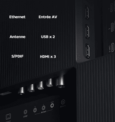 Niveau connectivité filaire, on retrouve une prise Ethernet, 3 prises HDMI (dont un ARC), 2 ports USB, une entrée AV, une antenne et une prise S/PDIF, alors que pour les connectivités sans fils, elle intègre du Wifi (2,4Ghz / 5Ghz), du Bluetooth 4.2 et un port infrarouge.