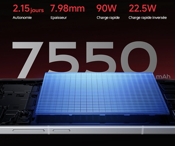 L’autonomie n’est pas en reste avec une batterie avec une densité élevée. La batterie à teneur ultra-élevée en silicium à 10% dispose d’une capacité de 7550mAh. L’épaisseur du téléphone reste faible malgré la grande capacité de batterie avec une épaisseur de 7,98mm. Le REDMI Turbo 4 Pro supporte également la charge rapide de 90W avec la puce de gestion de batterie Xiaomi Surge G1.