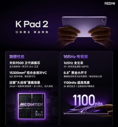 Dimensity 9500 | Écran 8.8” 3K 165Hz | Luminosité 1100 nits | Batterie 9100mAh + 67W | Refroidissement VC 15300 mm² | Audio Sound by Bose | Double USB-C