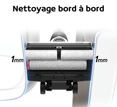 Le nettoyage bord à bord a été amélioré. Grâce à son système à 3 rouleaux disposés un à l’arrière sur toute la longueur et deux à l’avant, vous disposez d’un nettoyage au plus près des bords avec une marge inférieure à 1mm des 2 côtés.