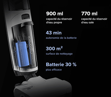 Le Roborock Dyad Pro utilise sa batterie efficacement (30% plus efficace que le Dyad). Ainsi avec une seule charge, il est possible de nettoyer jusqu’à 300m2 avec une autonomie de 43min. L’aspirateur intègre un réservoir d’eau propre de 900ml et un réservoir d’eau sale de 770ml.