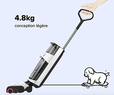 Ultra simple à utiliser et à déplacer… L’aspirateur-laveur utilise des rouleaux qui tournent dans les deux sens permettant de vous aider dans les déplacements. De plus, le Roborock Dyad Pro n’a un poids que de 4.8kg qui vous permet de le tirer et le pousser sans effort.