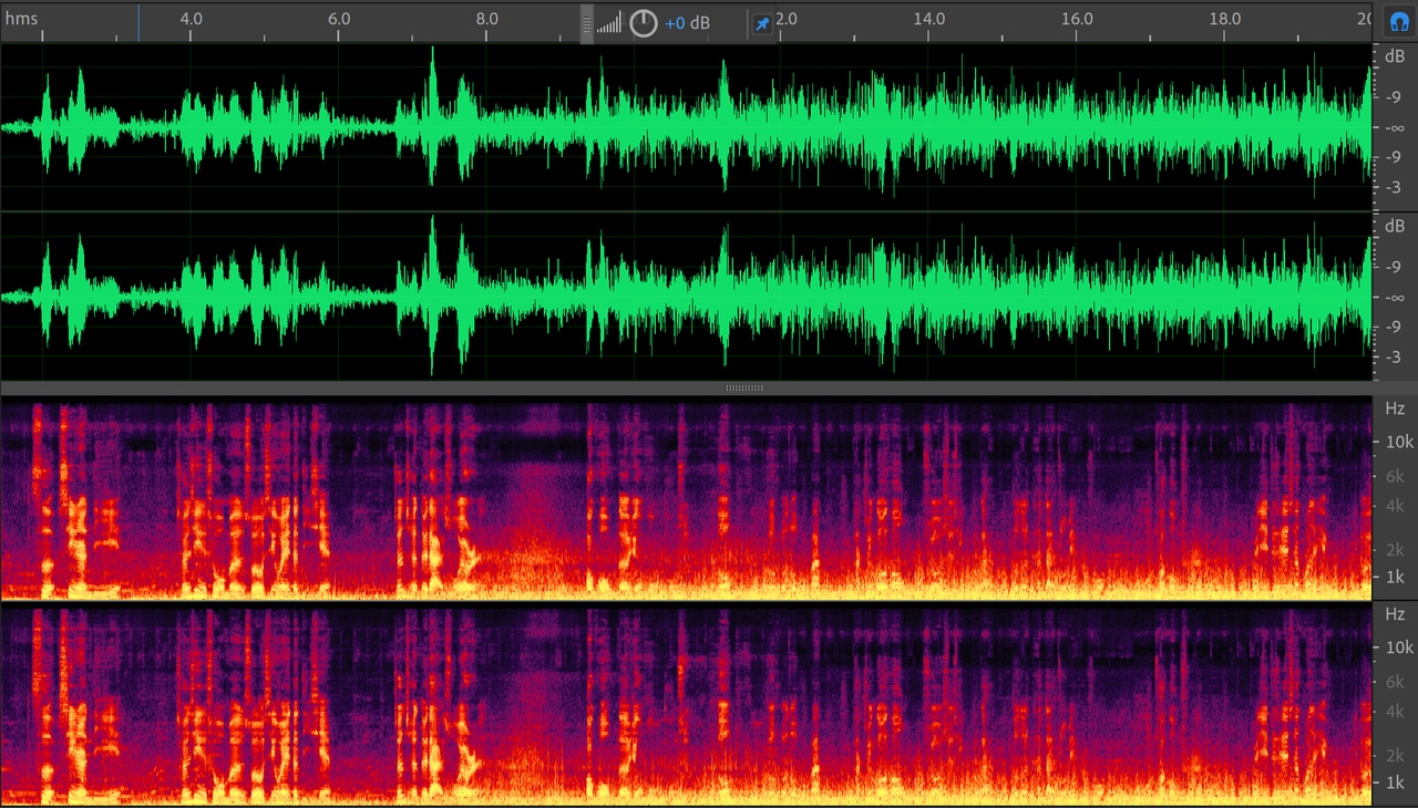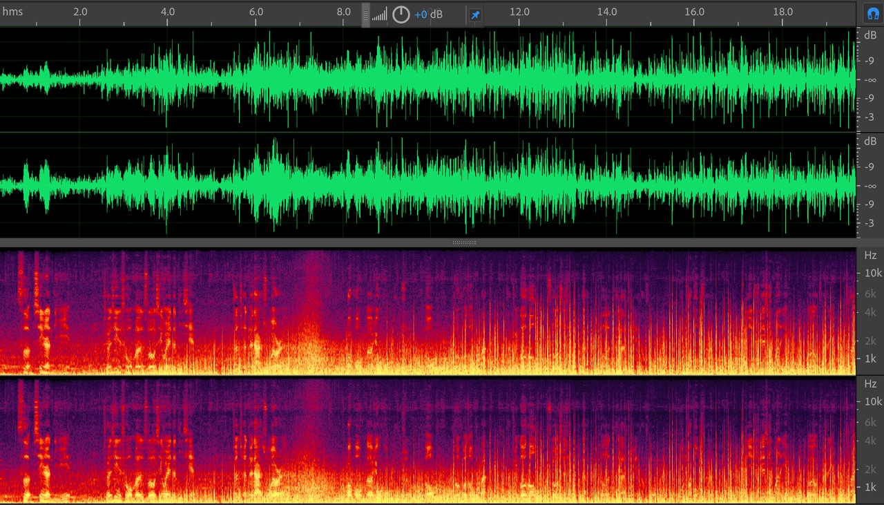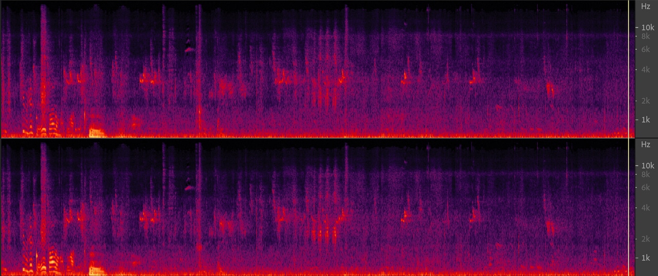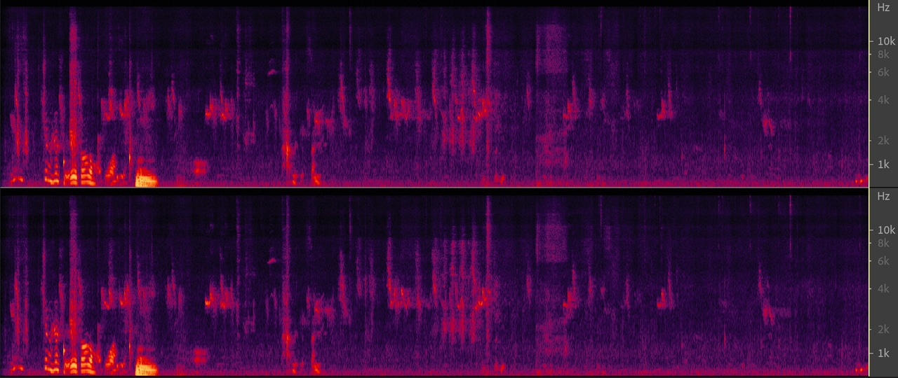 De même, lors d’un enregistrement dans une voiture en mouvement avec des discutions, l’air autour du téléphone circule rapidement pendant que la voiture roule, un fort bruit de vent sera généré dans l’audio enregistré, affectant sérieusement la clarté de la parole. En comparant les deux images ci-dessous, la parole dans la première moitié de l’image de gauche est noyée par le bruit du vent, et il y a de nombreuses lignes verticales jaune vif dans la seconde moitié du spectrogramme. En effet, le microphone est impacté par le flux d’air et produit un son. Lorsque vous utilisez un microphone dans la vie quotidienne, le son produit en soufflant dans le microphone avec la bouche est exactement le même. Le Xiaomi 14 Pro résout ce problème dans la plus grande mesure, rendant la voix enregistrée plus claire et plus intelligible.