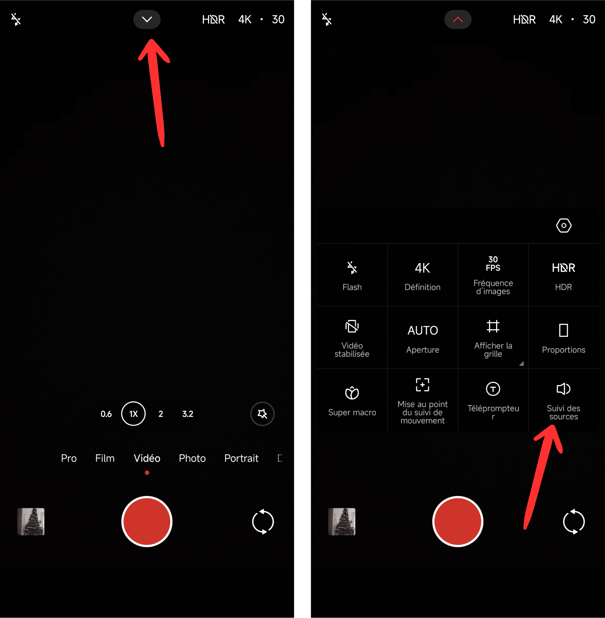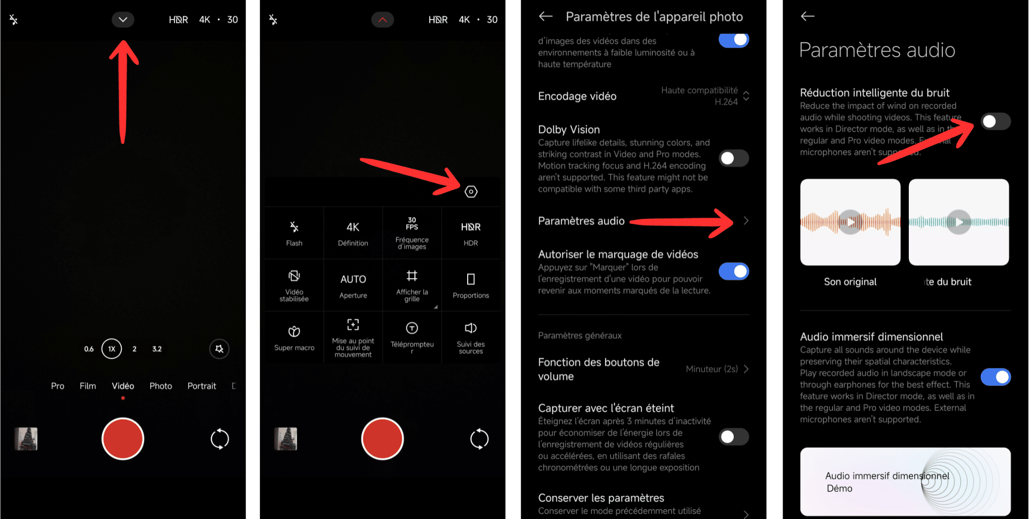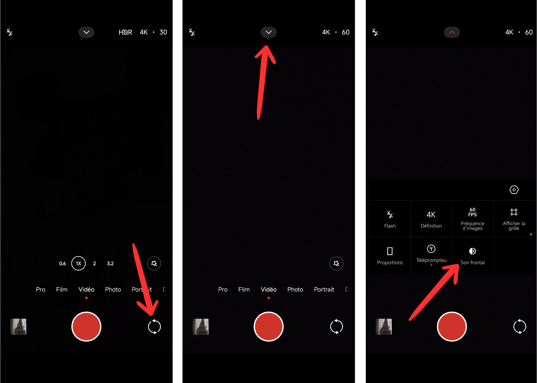 Examinons d’abord le mode d’enregistrement vidéo (normal). À partir de la série Xiaomi 14, la caméra frontale prend en charge l’enregistrement vidéo 4K à 60 images, ce qui est particulièrement adapté à la prise de vue de Vlogs personnels. C’est pourquoi nous avons également lancé une caméra frontale son frontal. Lorsque l’option n’est pas allumé, le téléphone capte par défaut tous les sons de l’espace environnant, sans mettre l’accent sur d’autres directions que les voix humaines ; si l’option son frontal est activée, le téléphone se concentrera sur l’enregistrement de la voix face à l’écran et supprimera les sons provenant d’autres directions. L’option « son frontal » peut être activée à travers les opérations suivantes :