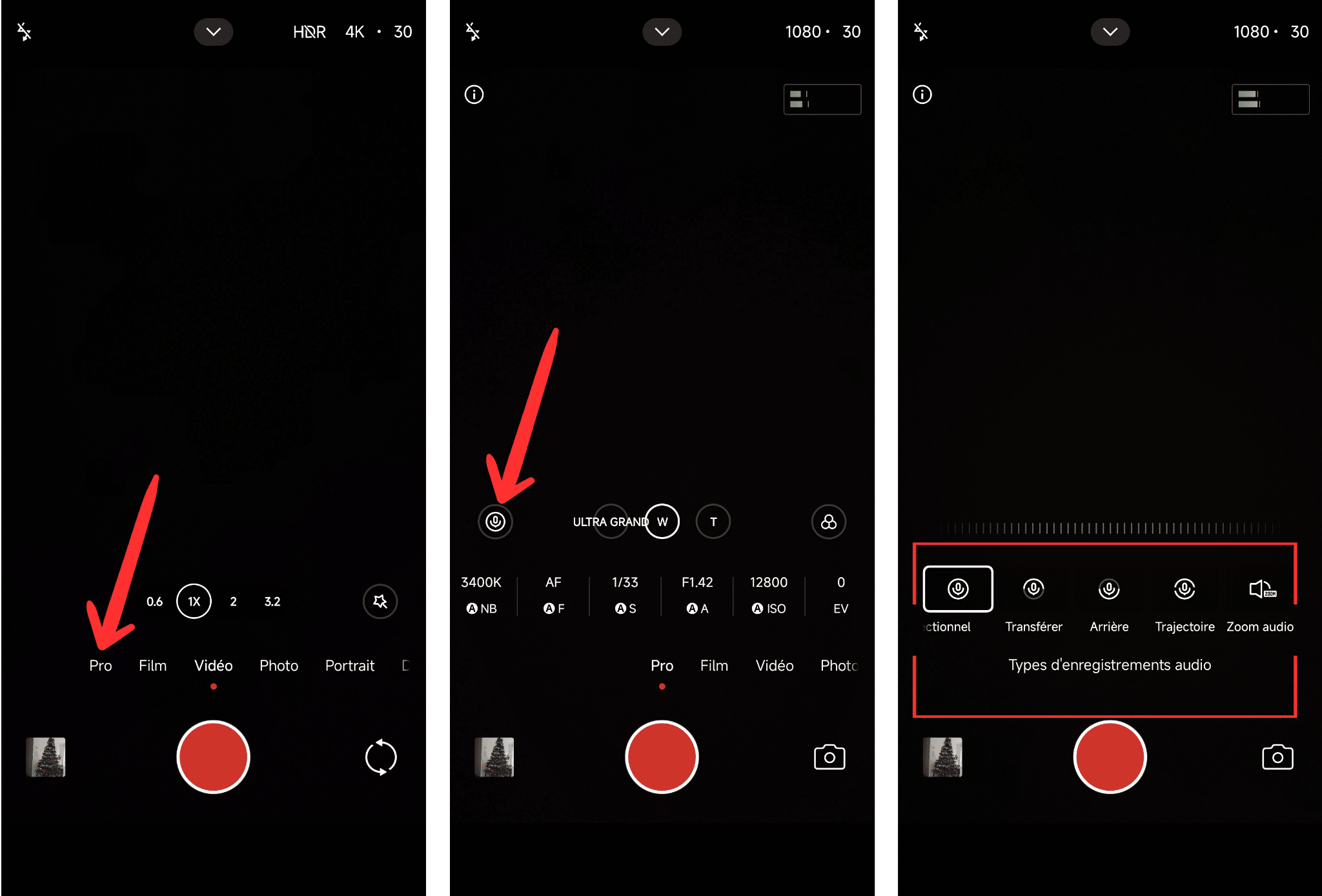 | 2 | Transférer | La capture audio est réalisée via le micro du côté de l’appareil photo principal du téléphone et les sons provenant d’autres directions sont supprimés. | Pour les réunions de famille et d’amis… L’objectif principal est de capturer des images et des sons depuis le côté de l’objectif principal de l’appareil photo du téléphone. |