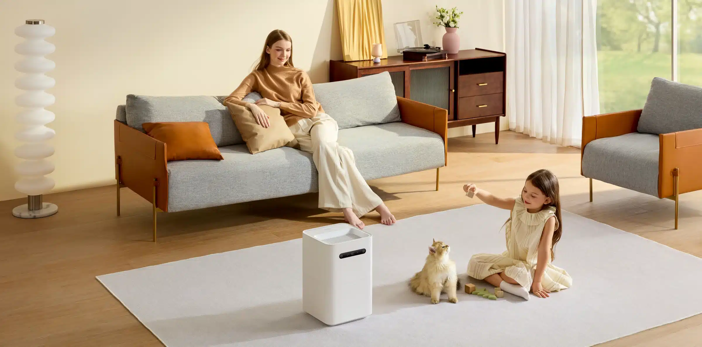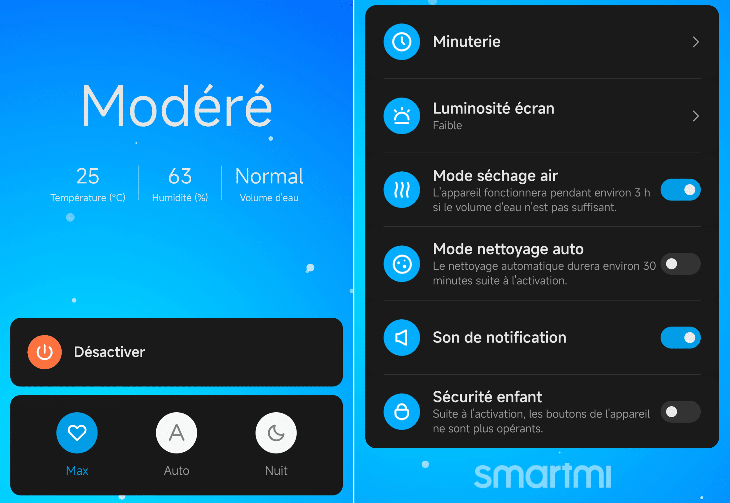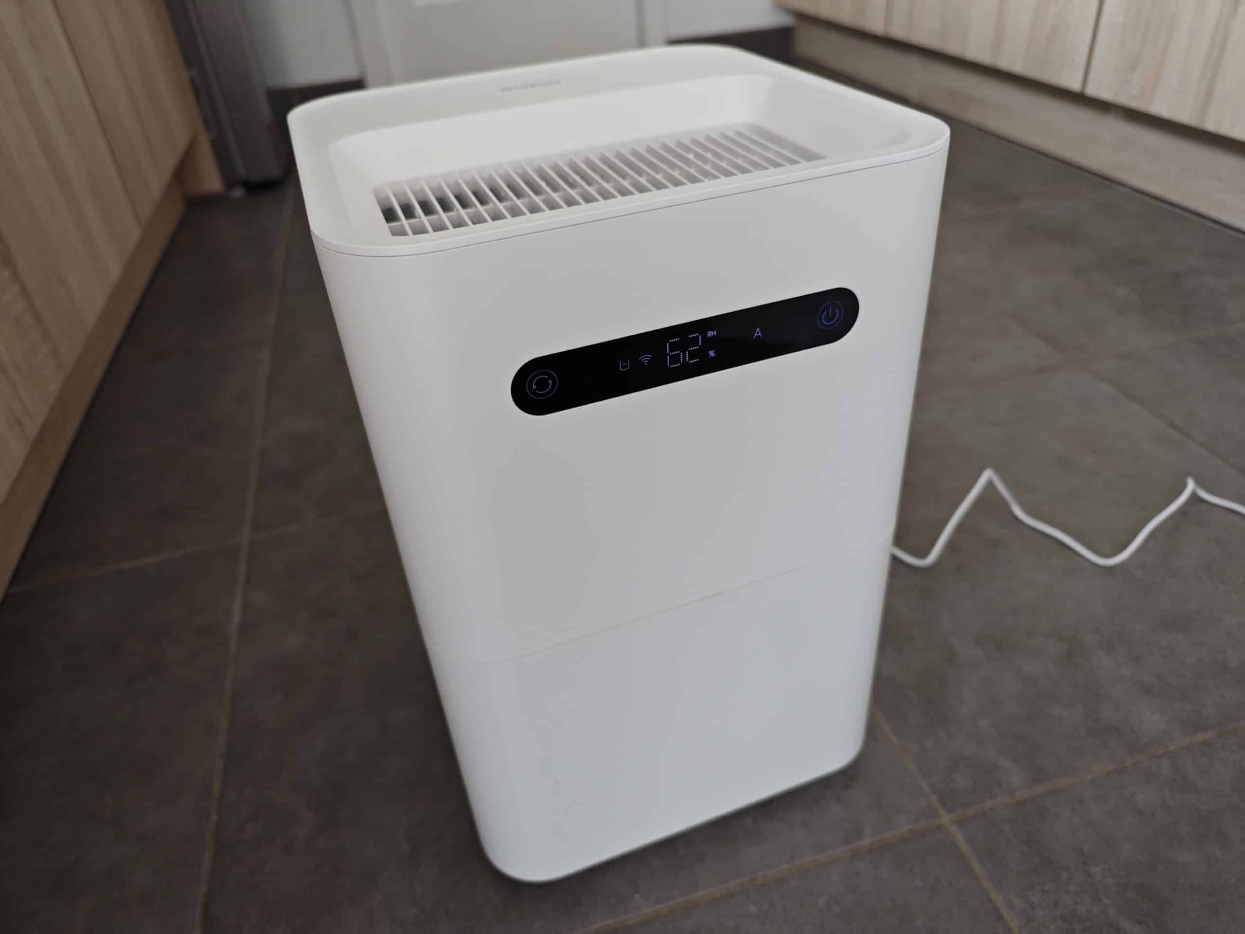 L’appareil est connecté via l’application Xiaomi Home (compatible serveur France) afin de le contrôler depuis n’importe où, et n’importe quand. On peux ainsi activer l’appareil ou l’éteindre, changer de mode, vérifier le taux d’humidité, … très facilement depuis votre téléphone. L’interconnexion avec d’autres appareils connecté via des scènes intelligentes est possible. Il est possible de régler l’humidité de 30 à 60% pour garder l’espace confortable avec le capteur arrière qui surveille en temps réel l’humidité de la pièce et ajuster automatiquement.