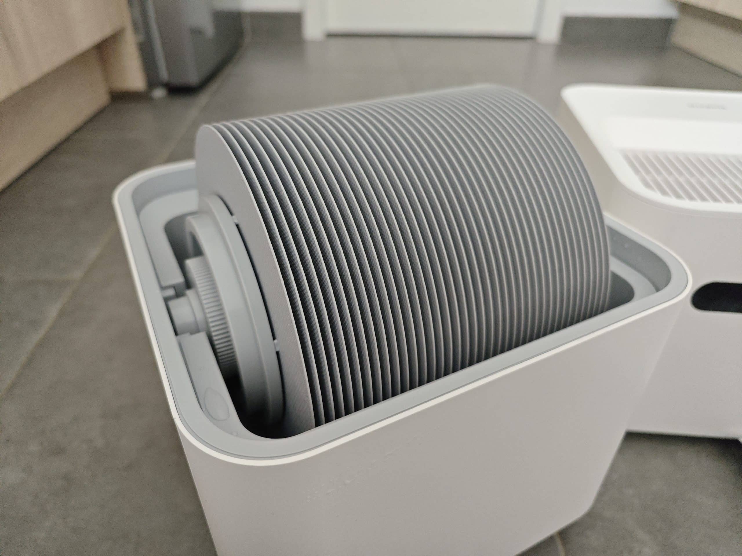 L’appareil a un peu la même apparence que les purificateurs d’air. Il mesure 260 x 260 x 405mm. Sur la face avant, on retrouve un écran LED, et sur le dessus, une ouverture permettant l’évaporation mais également le remplissage de l’appareil. Sur un des côtés, un indicateur de niveau d’eau a été intégré vous donnant une très bonne vision sur la nécessité de le remplir. À l’arrière, la prise pour l’alimenter est disposée ainsi qu’une entrée d’air à ne pas couvrir et le capteur de température et d’humidité.
