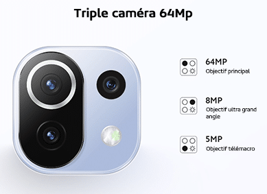 - Capteurs photos arrière : 64Mpx + 8Mpx + 5Mpx