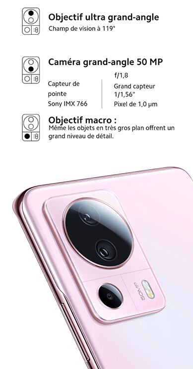 La conception double légèrement incurvée à l’avant et à l’arrière du Xiaomi 13 Lite permet une adaptation parfaite à la paume de la main. Le téléphone est léger avec un poids de 171g et fin avec une épaisseur de 7.23mm. Il est disponible en 3 couleurs (Noir, Rose ou Bleu). Une triple caméra 50Mp a été intégrée :