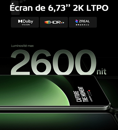 Le Xiaomi 13 Ultra est équipé d’un écran professionnel 2K ultra-précis de 6,73’’ développé avec TCL. Le nouveau matériau luminescent C7 offre une meilleure précision des couleurs et un meilleur angle de vision. On retrouve une luminosité maximale de 2600nit et avec le Ultra Dynamic Display 2.0, la luminosité est 5fois supérieure à celle des écrans traditionnels. Il dispose d’un taux de rafraichissement adaptatif de 1 à 120Hz (LTPO), un taux de rafraichissement tactile de 240Hz, et un affichage d’image à plage dynamique élevée HDR10+. L’écran en haut est percé afin d’y laisser place à la caméra selfie de 32Mp.