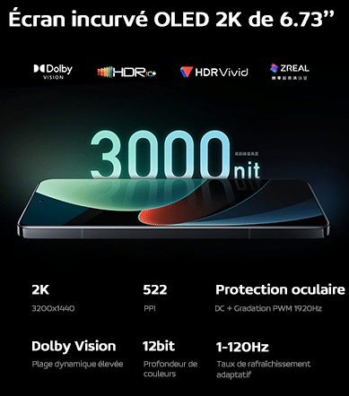 Le Xiaomi 14 Pro est équipé d’un écran incurvé OLED 2K 120Hz de 6,73’’ avec un nouveau matériau luminescent C8 qui offre un niveau professionnel de détails et économise de l’énergie. Il dispose d’un taux de rafraichissement adaptatif de 1 à 120Hz (LTPO), un taux de rafraichissement tactile de 240Hz, un affichage d’image à plage dynamique élevée HDR10+, et une luminosité maximale de 3000 nit. L’écran en haut est percé afin d’y laisser place à la caméra selfie de 32Mp capable de filmer en 4K.