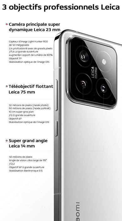 • Téléobjectif Leica de 50Mp (Distance focale équivalente de 75mm, 10cm super gros plan, Ouverture f/2,0, stabilisation d’image optique OIS et EIS, Objectif 6P)