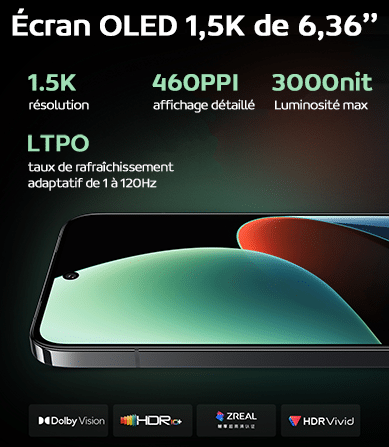Le Xiaomi 14 est équipé d’un écran droit OLED 120Hz de 6,36’’. Équipé du nouveau matériau luminescent C8, il a une résolution de 1,5K et une précision d’affichage jusqu’à 460PPI, et chaque détail est affiché particulièrement délicatement. La luminosité maximale de 3 000 nits et la technologie de super précision des couleurs vous apportent un effet d’affichage plus vif et plus réaliste. Il dispose d’un taux de rafraichissement de 120Hz adaptatif (LTPO), un taux de rafraichissement tactile de 240Hz, un affichage d’image à plage dynamique élevée HDR10+. L’écran en haut est percé afin d’y laisser place à la caméra selfie de 32Mp.