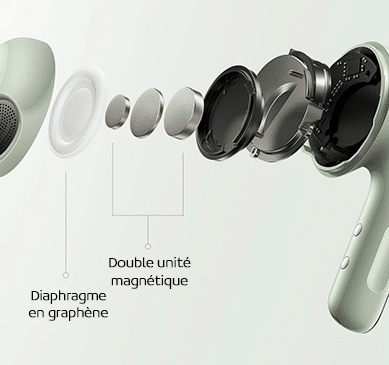 Le diaphragme en graphène ulta-fin a une réponse rapide et une grande rigidité rendant les aigus plus naturels. La double unité magnétique apporte une amplitude dynamique élevée, réduit la distorsion et fait monter les basses.