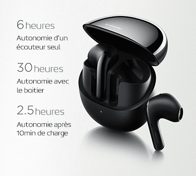 L’autonomie des écouteurs seuls peut atteindre 6 heures et avec le boitier de charge peut aller jusqu’à 30 heures. En chargeant 10 minutes, vous pouvez écouter en continu jusqu’à 2,5 heures de musique.