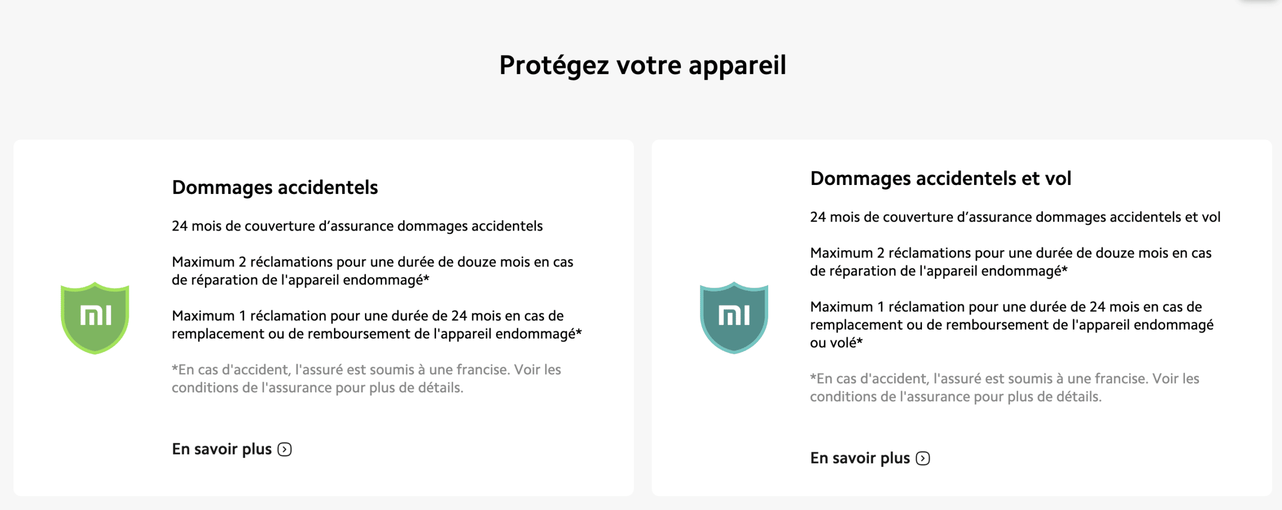 Pour répondre aux différents besoins des clients, Xiaomi Care propose deux formules d’assurance complètes qui peuvent être achetées en même temps qu’un nouveau produit ou en tant que protection supplémentaire :