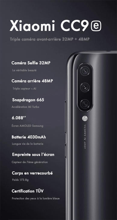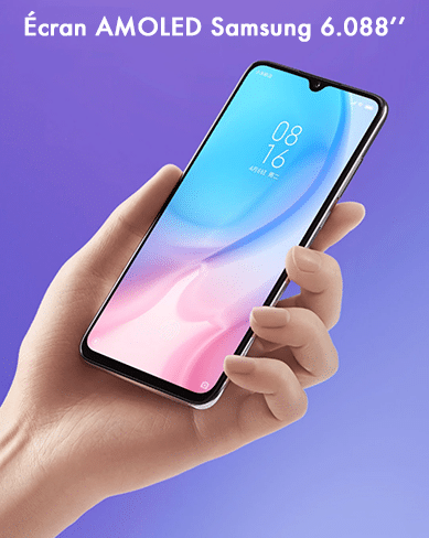 Le Xiaomi CC9e est équipé d’un grand écran Samsung de 6,088’’ AMOLED protégé par un Gorilla Glass 5. Il dispose de la suppression de la lumière bleue afin de protéger vos yeux. Le lecteur d’empreinte de 7ème génération est situé sous cette écran et a été amélioré comparer au Xiaomi Mi 9 et au Xiaomi Mi 9T.