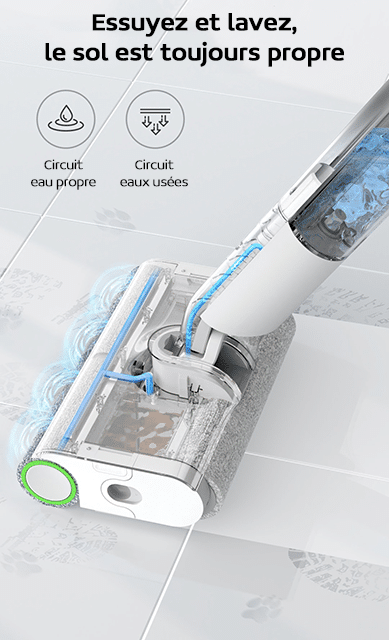 Durant le nettoyage, l’eau propre est aspergée sur les rouleaux et l’eau sale est recyclée afin de garder continuellement les brosses propres. Après le nettoyage, il suffit de remettre le balais sur sa base et appuyer sur le bouton pour démarrer le nettoyage des brosses. Contrairement à la serpillière traditionnelle, vos mains restent propres et sèches durant tout le processus.