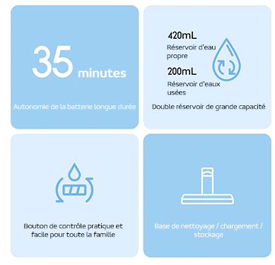 Pour que vous puissiez nettoyer, Xiaomi a intégré une batterie lui donnant une autonomie de 35min. De plus, il bénéficie d’un réservoir d’eau propre d’une capacité de 420ml et d’un réservoir d’eaux usées de 200ml.