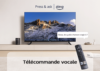 La télécommande Bluetooth 360° et infrarouge permet de contrôler au doigt et… à la voix la télévision. En effet elle intègre un micro permettant de lancer Alexa pour changer de chaîne, augmenter le son, ouvrir une application, …