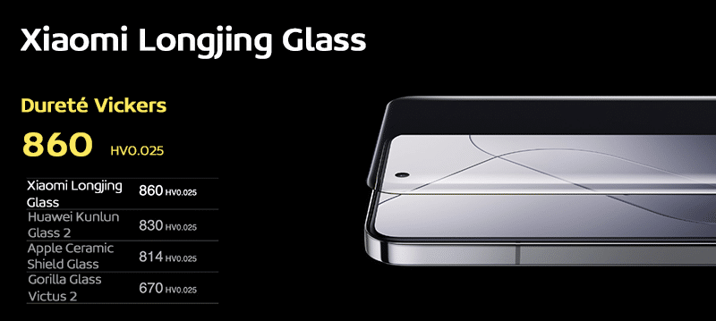 Enfin, Xiaomi a utilisé le squelette ultra résistant du Shield Glass pour créer une surface gaussienne parfaite avec quatre côtés de profondeur égale. Sa dureté Vickers atteint 860, soit 5 % plus dure que le panneau en super céramique, tout en offrant une résistance aux chutes de plus de 20 %.