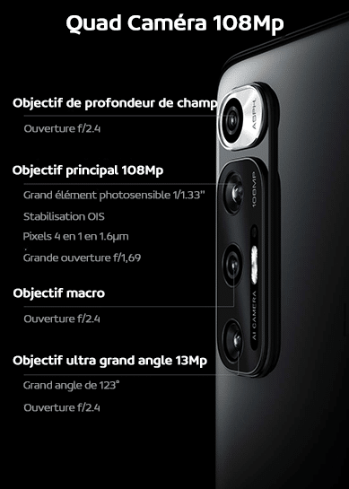 - Capteurs photos arrière : 108Mpx + 2Mpx + 2Mpx + 13Mpx
