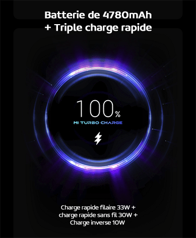Niveau énergie, le Xiaomi Mi 10S est doté d’une batterie 4780 mAh. Il sera possible de le recharger rapidement avec un triple système de charge rapide ! En effet, il dispose de la charge rapide filaire 33W, la charge rapide sans fil 30W et la charge inversée sans fil 10W. La charge 33W filaire permet d’obtenir un chargement total en 56min seulement. Cette dernière vous permettant de recharger un autre téléphone (compatible charge sans fil) ou vos accessoires directement en les posant au dos de votre Xiaomi Mi 10S…