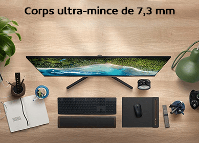 L’épaisseur de l’écran n’est que 7,3mm afin de garder un espace de bureau propre et organisé. Peu importe l’angle dans lequel l’écran est vu, il reste mince, léger et simple…