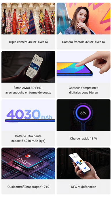 Le processeur Snapdragon 710 (10nm) de Qualcomm sera donc le cœur du Xiaomi Mi 9 Lite. Il est couplé à 6Gb de RAM et un stockage de 64gb ou 128gb. Le GPU est un Andreno 616. Il est équipé des algorithmes Game Turbo 2.0 et Mi Turbo