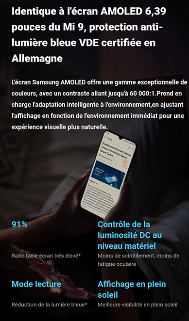 Le Xiaomi Mi 9 Lite est équipé d’un grand écran Samsung de 6,39’’ AMOLED couvrant 91% de la face avant du téléphone protégé par un Gorilla Glass 5. Son « menton » ne mesure que 3.6mm. Le lecteur d’empreinte de 7ème génération est situé sous cet écran et a été amélioré comparé au Xiaomi Mi 9 et au Xiaomi Mi 9T. Des nouveaux affichages « mode veille » ont été ajoutés.