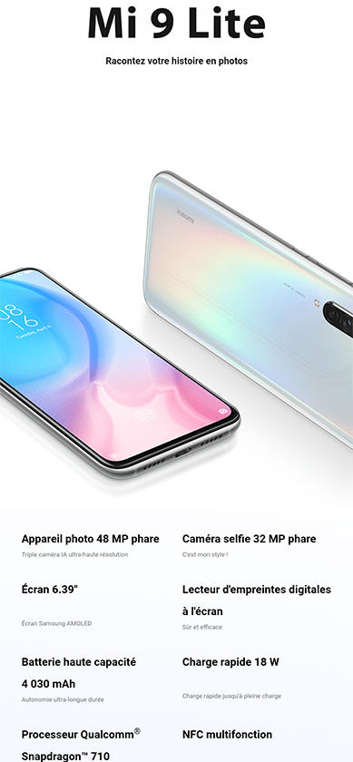 Niveau énergie, le Xiaomi Mi 9 Lite est doté d’une batterie de 4030 mAh restant cependant léger avec ces 179gr. Il sera possible de le charger rapidement avec le système de charge rapide 18W (filaire). Xiaomi vous a écouté et a donc sorti son nouveau téléphone en y intégrant le capteur IR et la prise casque 3,5mm (jack) qui prend en charge la certification Hi-Res Audio. Il dispose également d’une puce NFC