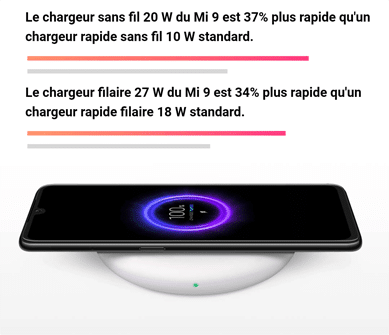 Niveau énergie, le Mi 9 est doté d’une batterie de 3300 mAh. Il sera possible de le charger rapidement avec le système de charge rapide 27W (filaire) ou en charge sans fil 20W. En comparant cette dernière avec la charge filaire 18W d’un Mi 8, on arrive à un temps de chargement total de 1h30 dans les deux cas.