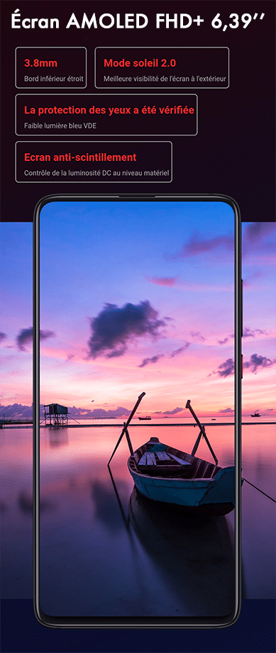 Le Xiaomi Mi 9T Pro est équipé d’un grand écran de 6,39’’ AMOLED couvrant 91,9% de la face avant du téléphone protégé par un Gorilla Glass 5. Son menton est légèrement plus épais que le Xiaomi Mi 9 mesurant 3,8mm (contre 3,6mm pour le Mi 9). Full-écran, pas d’encoche ni de notch, il dispose de bord extra fin de 1,8mm pour les côtés et 2,1mm pour le haut cachant le haut-parleur. Le lecteur d’empreinte pour le déverrouillage est situé sous l’écran.