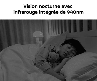La vision nocturne est présente avec sa lumière infrarouge intégrée de 940nm. Aucune lumière rouge n’est visible avec son activation ce qui permet de pouvoir dormir paisiblement.