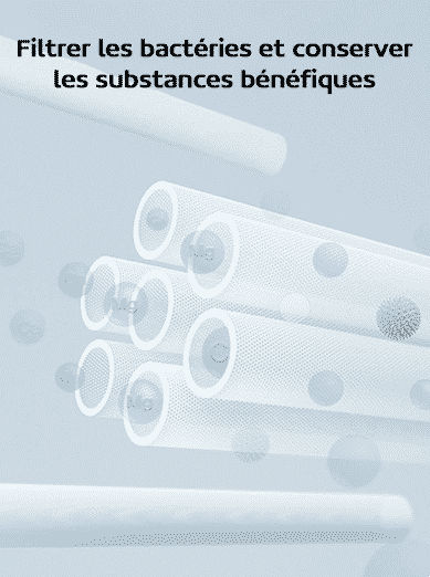 Le purificateur utilise une membrane d’ultrafiltration à fibres creuses avec une précision de filtration de 0,1μm. Ainsi, il peut filtrer efficacement les bactéries nocives dans l’eau, tout en conservant les substances bénéfiques. La filtration est plus saine.