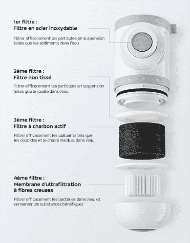 Le Xiaomi Mi Faucet Water Purifier dispose de 4 couches de filtration. Il peut ainsi filtrer la rouille, les sédiments, les colloïdes et autres particules présentes dans l’eau, mais également les gaz résiduels et les bactéries.