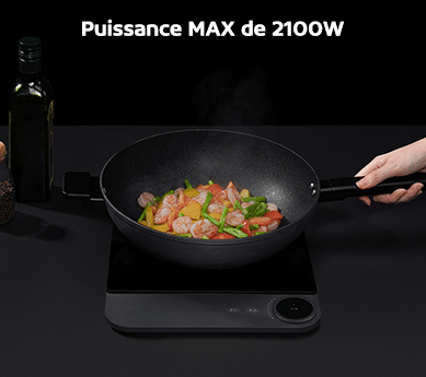 La puissance maximum de la bobine de cuivre pur peut être mise en évidence. Les plats sautés traditionnels chinois ne sont pas un problème avec une puissance max de 2100W.