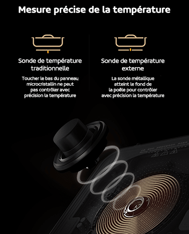Mais la marque a été plus loin, la sonde de température a été installée hors du panneau microcristallin, en contact direct avec votre poêle. Ainsi la température de la poêle est surveillée en temps réel et un réglage intelligent de la température est réalisé.