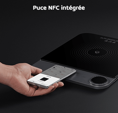Équipé d’une puce NFC, vous pouvez poser votre téléphone sur l’avant de la plaque à induction afin de voir différentes recettes. Vous serez guidé pour terminer la cuisson et mettre les ingrédients au bon moment.