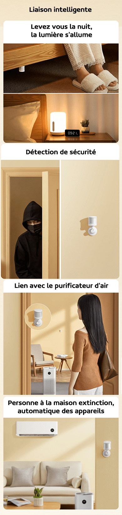 La liaison avec d’autres appareils de la marque est riche et facile. En effet, vous vous levez la nuit et la lampe de chevet s’allume automatiquement, ou pour la sécurité de votre maison, vous recevez une notification en cas d’effraction ! Lorsque vous rentrez chez vous, vous pouvez allumer automatiquement le purificateur d’air.