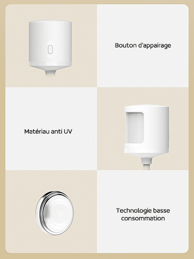 Xiaomi a choisi d’y intégrer un bouton d’appareillage beaucoup plus pratique que le trou où il fallait utiliser un extracteur de carte sim. La coque est en plastique anti-UV permettant une forte résistance et éviter un changement de couleur. L’autonomie du capteur peut aller jusqu’à 1 an grâce à sa pile bouton CR2450.