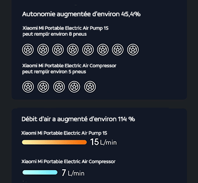 Xiaomi a optimiser son petit compresseur afin donc d’améliorer principalement les performances. L’endurance à pleine charge a été augmentée d’environ 45,4%. Le regonflage de 2 pneus de voiture avec une pression nulle ne prend que 11 minutes. L’autonomie totale permet de regonfler jusqu’à 8 pneus (contre 5 pneus dans la version précédente). Le débit d’air a été amélioré également de 114% avec 15 L/min pour ce nouveau modèle (contre 7 L/min pour le précédent)