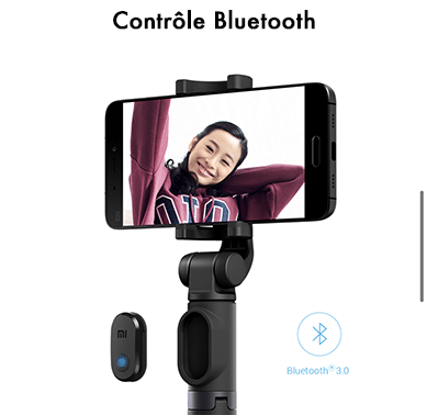 Et quand on parle de trépied, on parle souvent de contrôle à distance. Sur ce point, nous ne sommes pas en reste, car la mi selfie stick tripod, a intégré un contrôle via un bouton séparé. Ce dernier est appairable au téléphone. Il intègre le Bluetooth 3.0 et donc fonctionne avec la majorité des téléphones (sous Android 4.3 et plus récent iOS 5.0 et plus récent).