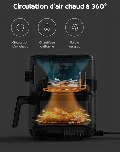 Le Xiaomi Mi Smart Air Fryer 3.5L utilise la technologie d’air chaud circulant à 360° enveloppe les aliments réduisant l’huile et la graisse. Le flux de chaleur tourne à grande vitesse, les aliments sont donc chauffés uniformément. L’extérieur est croustillant et l’intérieur reste tendre.