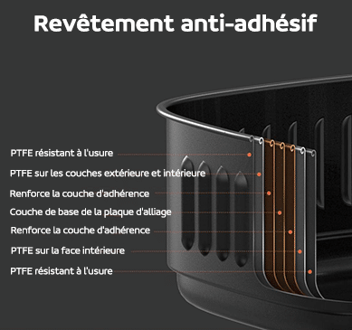 Le plat de cuisson est en composite à 7 couches avec un revêtement antiadhésif double couche en PTFE de qualité alimentaire. Le plat est donc sain, mais aussi très résistant à l’usure et très facile à nettoyer.