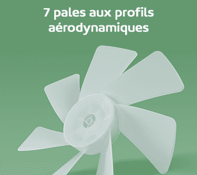 Ce nouveau ventilateur dispose de 7 pales aux profils aérodynamiques de grande surface. Elles permettent de couper uniformément et densément le flux d’air et ainsi restaurer au mieux la douceur et la fraîcheur du vent naturel.